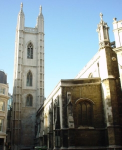 There has probably been a church on the site of St Mary Aldermary in Bow Lane for over 900 years. “Aldermary” (Older Mary) could imply that it is older than St Mary-le-Bow. An early 17th century building was virtually destroyed in the Great Fire 400 years ago and the present building, which survived the Blitz relatively undamaged, is a Wren design from 1704 and unique because of its Gothic style with an interesting fan-vaulted ceiling.